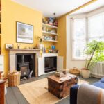 Fireplace, wooden flooring, built in storage to chimney recesses, radiator, sash window, spotlights.