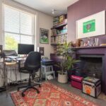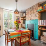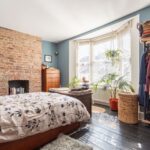 Wooden flooring, sash bay windows, radiator, exposed brick fireplace, spotlights.