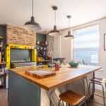 Gas range cooker, wood topped kitchen island with storage cupboards under, stainless steel sink unit with mixer tap, sash windows, door to alternate front access with gated bike storage. Built in fridge and freezer, vertical radiator.