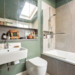 Tiled flooring, W.C, tiled bath with thermostatic shower over. Floating sink unit with mixer tap. Built in mirrored storage cupboard, vertical radiator, Velux window, and sash window, underfloor heating, cat flap, recessed spotlighting.