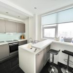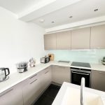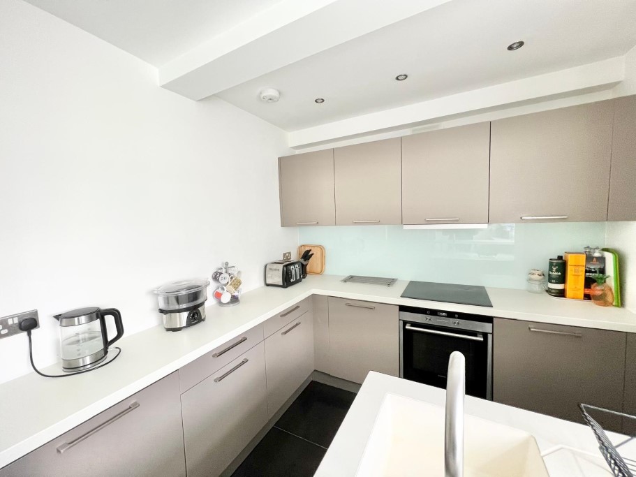 Dark grey gloss units and white counter tops, dark grey tiled floor, under counter integrated fridge, washing machine and freezer, Siemens single oven, electric induction hob and extractor fan, white sink and drainer, breakfast bar, spotlights, double-glazed window with Westerly sea views.