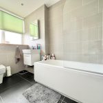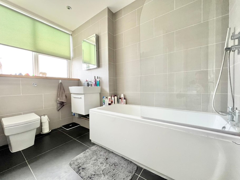Bath with rainforest shower and handheld fitments above, fitted glass shower screen, W.C with enclosed cistern, vanity unit and basin, black floor tiles, cream wall tiles, spotlights, large stainless heated towel rail.